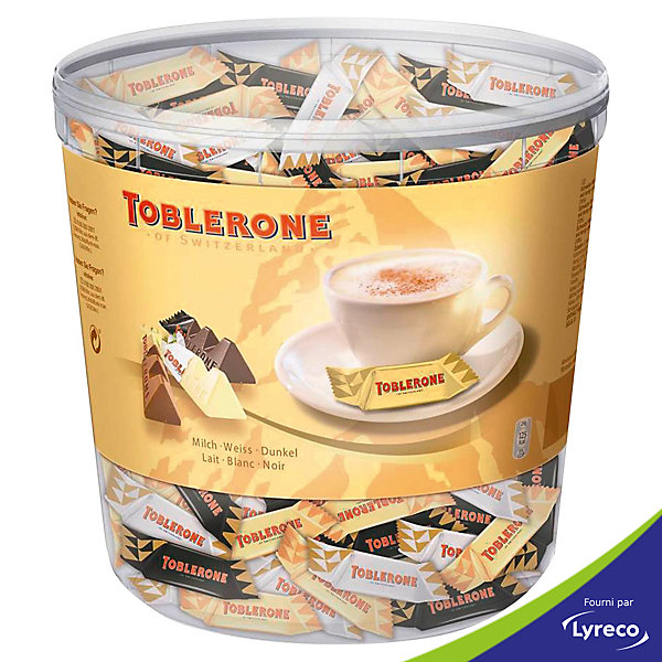 – assortiment de mini-toblerone de 6 g au chocolat blanc, au lait et noir. – mini-barre de chocolat suisse a base de miel et de nougat aux amandes, reconnue par sa forme triangulaire. – cree en 1908 par theodore tobler ! pour votre sante, evitez de manger
