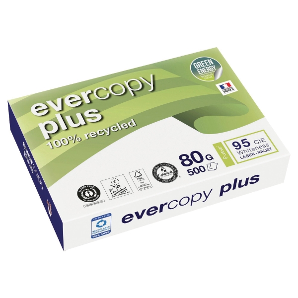 Le papier blanc recycle a4 clairefontaine evercopy plus est le papier ecoresponsable top de la polyvalence ! papier 100% naturel provenant de 100% de papiers de recuperation et de vapeur d’origine biomasse, il genere seulement 6% de dechets lors de son processus de fabrication. il sera votre allie ideal pour vos photocopies et impressions quotidienne laser et jet d’encre. papier qualifie colorlok par hp d’une blancheur naturelle 95 cie. conditionnement minimum au carton de 5 ramettes de 500 feuilles.