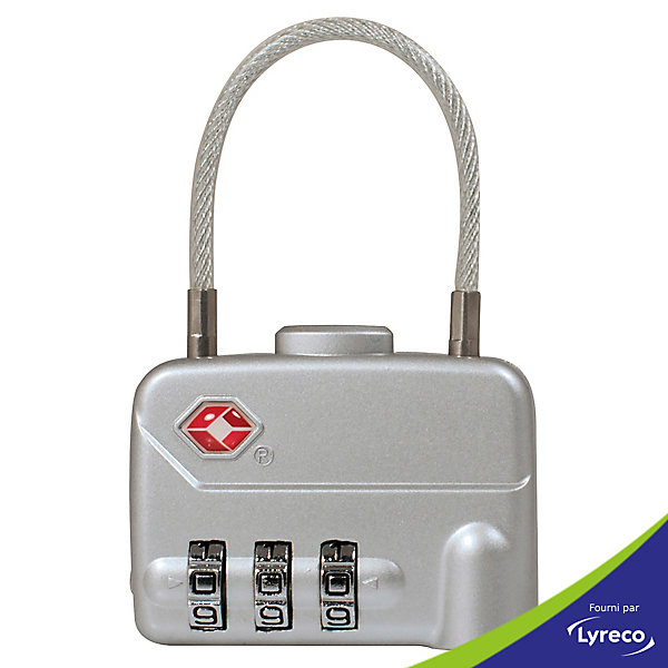 Fermeture par combinaison a 3 chiffres. materiau : metal. dimensions corps : h 35 x l 50 x p 14 mm. longueur du cable : 100 mm. hauteur avec cable : 78 mm.
