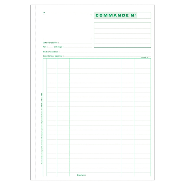 Ce carnet se compose de 50 feuillets numerotes et autocopiants en 2 exemplaires (1 original 1 copie) qui vous permet de noter et d’enregistrer les commandes. les 1er et 2eme feuillets sont microperfores et se detachent facilement, le 3eme feuillet reste dans le carnet.