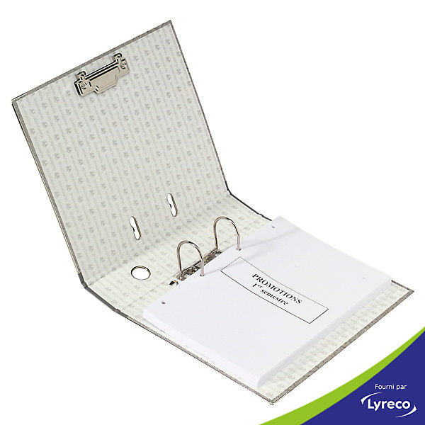 Carton 25/10 recouvert papier marbre gris. coins metalliques et renforts. pour format a4. dimensions : l 29 x h 32 cm. dos balacron de 7 cm. mecanique 75 mm.