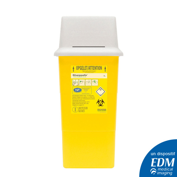 Récupérateur Sharp’Safe pour la collecte des déchets médicaux dangeureux ou présentant un risque infectieux. Il convient au traitement des objets tranchants et perforants.Couvercle rigide résistant au choc. La fixation sur la cuve jaune permet d’assurer l’étanchéité de l’ensemble.Comporte un indicateur visuel de remplissage.Contenance : 7 lRésistance thermique : 134°Dispositif médical fourni par EDM Imaging.Franco de port à partir de 250,00€ TTC. En dessous participation de 20,00€ TTC.