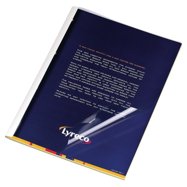 Chemises 240 g. dessus polyester transparent, dos et dessous blanc grain lisse. pour format a4. épaisseur : 1,5 mm. jusqu’a 15 feuilles (papier 80 g/m²).