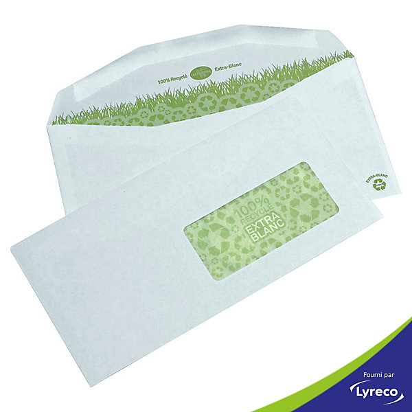 enveloppes de mise sous pli automatique certifiee nf environnement et 100% compensee carbone, recyclees et extra-blanches issues d’un tri selectif des papiers collectes post-consommation. de format dl+ (114 x 229) en papier fsc recycle 80 g/m² a fenetre papier cristal 45 x 100 mm, position 20 bi/20 bd. compatibles avec toutes les machines. graphisme imprime a l’encre a l’eau. pattes laterales larges pour un accompagnement optimal du document lors de l’insertion. pattes laterales 20 mm.