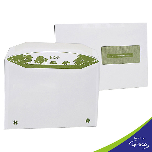 enveloppes de mise sous pli automatique format c4 (229 x 324) avec fenetre papier cristal 105 x 50 mm, position 28bi/60bd, en papier fsc recycle 90 g/m² et extra-blanches issues d’un tri selectif des papiers collectes post-consommation. certifiee nf environnement et 100% compensee carbone. compatibles avec toutes les machines. graphisme imprime a l’encre a l’eau. pattes laterales de 19 mm pour une insertion a plat.