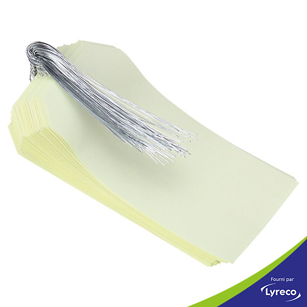 cartonnette 160 g/m² format 57 x 120 mm avec oeillet renforce. sans impression. avec fil de fer galvanise. ideal pour le marquage des pieces detachees, des bagages et des objets.