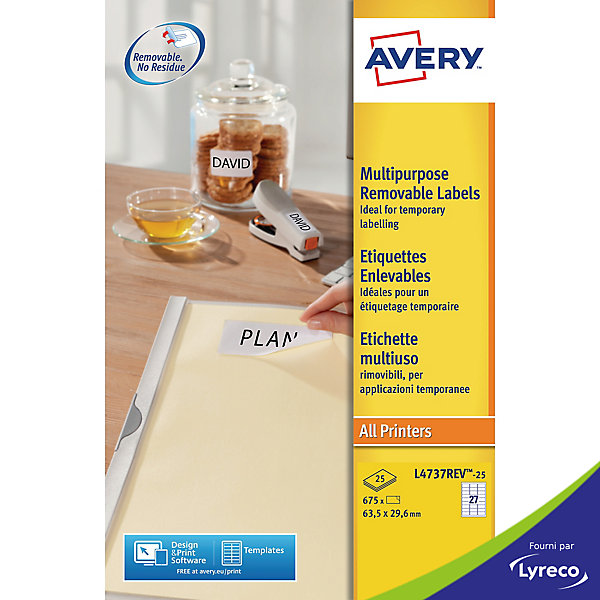 Adherent parfaitement et se retirent sans trace. pour tenir a jour vos dossiers, produits, creer des instructions provisoires sans abimer le support. modeles et logiciels gratuits sur www.avery.fr. ecologiques : recyclables et certifiees fsc (issues de forets gerees durablement). 63,5 x 29,6 mm. 27 etiquettes par feuille. 675 etiquettes par boite.