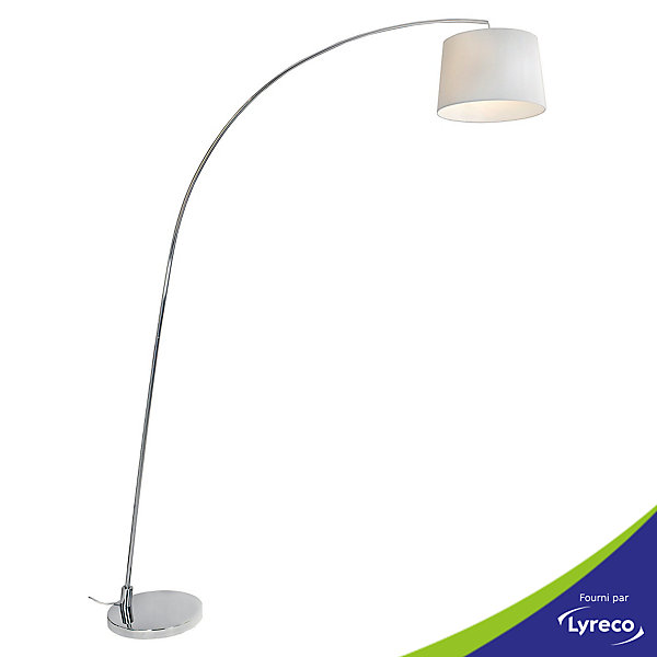 Lampadaire forme arc, equipe d’une ampoule led ge bright stik e27 12w. metal chrome, abat-jour cylindrique en coton blanc (øbas 38 cm, øhaut 33 cm et hauteur 25 cm). hauteur du lampadaire 210 cm. socle ø 33 cm. deporte 155 cm. interrupteur a pied sur cable. flux lumineux : 1150 lumens. temperature de couleur : 4000 k°. classe energetique : a+. produit livre avec ampoule. livraison directe fabricant sous 10 jours ouvres. produit ni repris ni echange. nos prix incluent une livraison au rez-de chausse