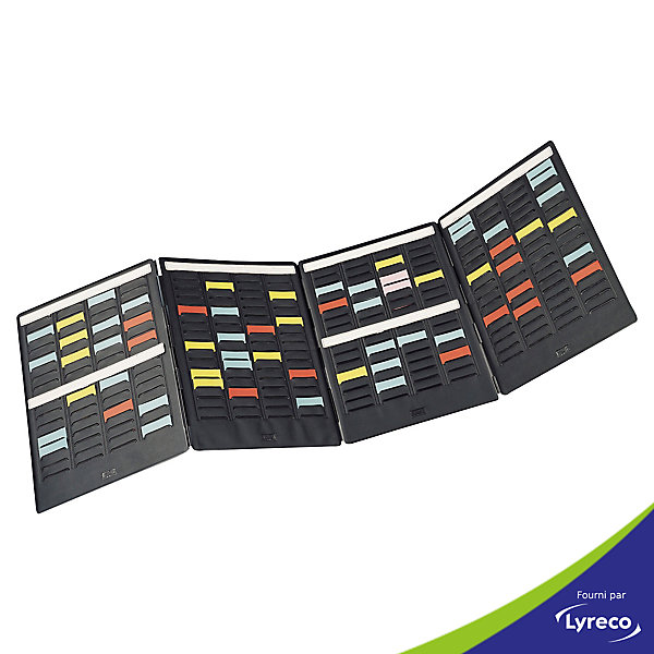 Planning portatif compose de 4 volets et d’une capacite de 272 fiches indice 1,5 (4 colonnes de 17 fiches par volet). ideal et pratique au bureau, le syteme de charniere permet un deploiement a plat. il se transporte aisement car il se plie en accordeon. format plie : l 24 x h 31,5 cm. format deplie : l 96 x h 31,5 cm. livre avec 1000 fiches t indice 1,5 coloris assortis.
