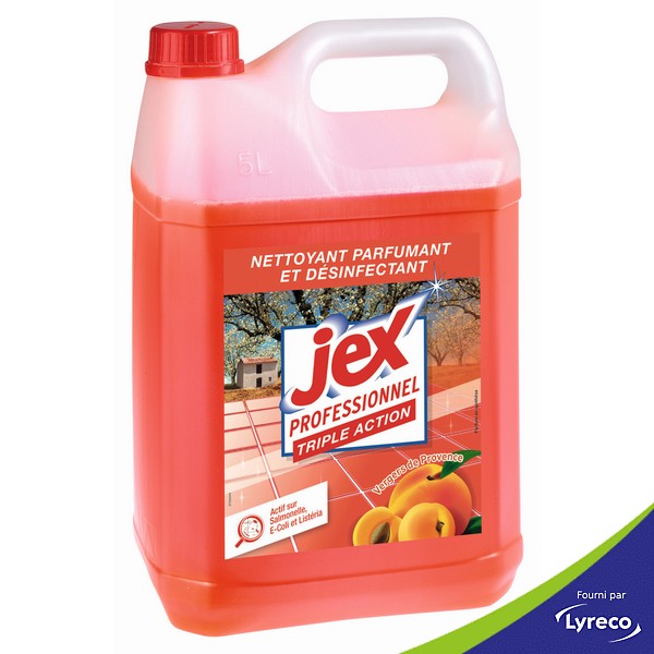 Le nettoyant multi-usages jex professionnel triple action nettoie, parfume et desinfecte en un seul geste. sa nouvelle formule possede une efficacite renforcee. pour les sols et les surfaces, il degraisse et elimine les taches tenaces. bactericide il elimine 99,99% des bacteries (en1276). actif sur salmonelle, e-coli et listeria. – parfum vergers de provence : laisse un parfum agreable longue duree. – dosage facilite grace au bouchon doseur. – contenance : 5 l. – usage : 3%, verser 150 ml de produit pour 5 l d’eau, laisser agir 5 min, rincer si necessaire (en milieu alimentaire le rinçage est obligatoire). – avant toute utilisation, assurez-vous que celle-ci est indispensable, notamment dans les lieux frequentes par le grand public. privilegiez chaque fois que possible les methodes alternatives et les produits presentant le risque le plus faible pour la sant[…]