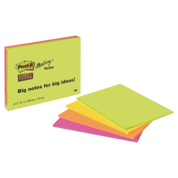 NOTES POST-IT SUPER STICKY – 152 X 203 MM – ASSORTIS – 4 X 45 FEUILLES