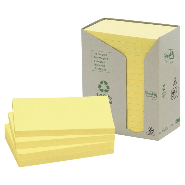 Notes recyclées Post-it – 76 x 127 mm – jaunes – tour 16 blocs x 100 feuilles