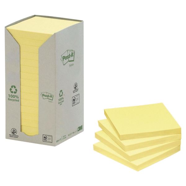 Notes recyclées Post-it – 76 x 76 mm – jaunes – tour 16 blocs x 100 feuilles