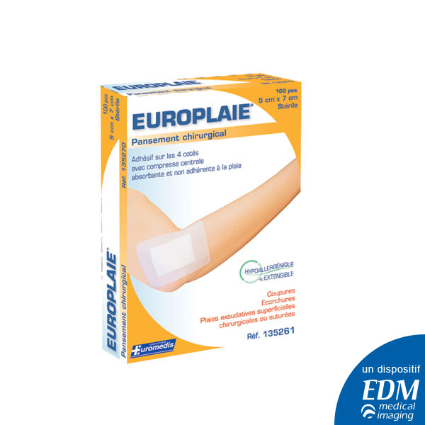 Pansement stérile Europlaie en non tissé. Il présente un adhésif sur les 4 côtés pour la fixation du pansement. La compresse de gaze absorbante centrale est recouverte d’un film de Mylar.Dimensions des pansements : 5 x 7,2 cmConditionnement : boîte de 100 unitésDispositif médical fourni par EDM Imaging.Franco de port à partir de 250,00€ TTC. En dessous participation de 20,00€ TTC.