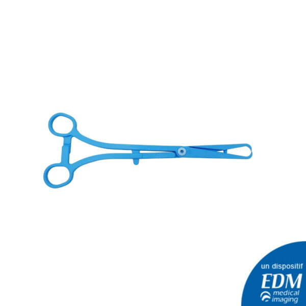 Pince de Pozzi droite à usage unique. Emballage sous sachet individuel stérile. Système de fermeture à trois crans sécurisé. Pince biocompatible en ABS.