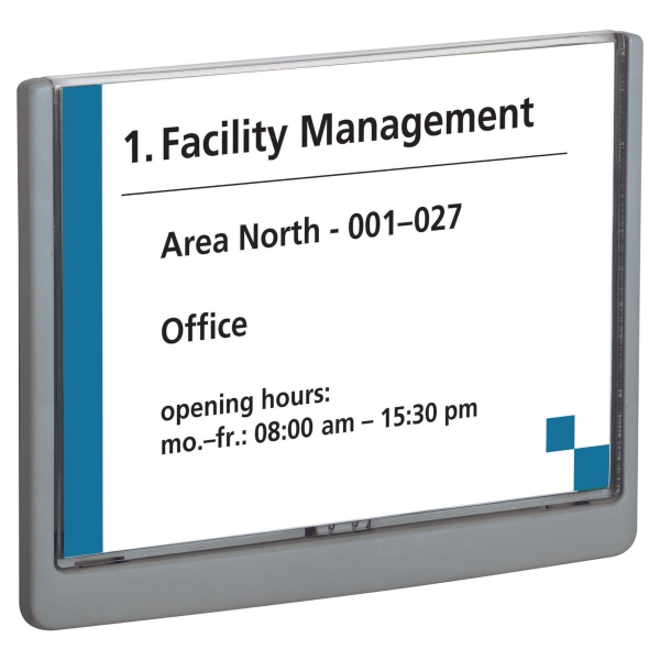 Plaques de porte composee d’un cadre profile en abs et d’une plaque de protection en acrylique. systeme d’ouverture facile pour l’insertion du bristol. finition soignee. personnalisable gratuitement sur www.durable.fr. livree avec vis et pastille adhesive. format a5 : 21 x 14,8 cm.