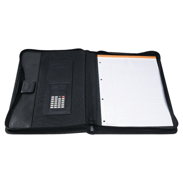 Porte-bloc en polypropylene, fermeture zippee. equipe d’une double poche avec fermeture pression pour documents a4, porte-stylo et emplacement pour carte de visite. livre avec un bloc papier a4 ligne et une calculatrice solaire.