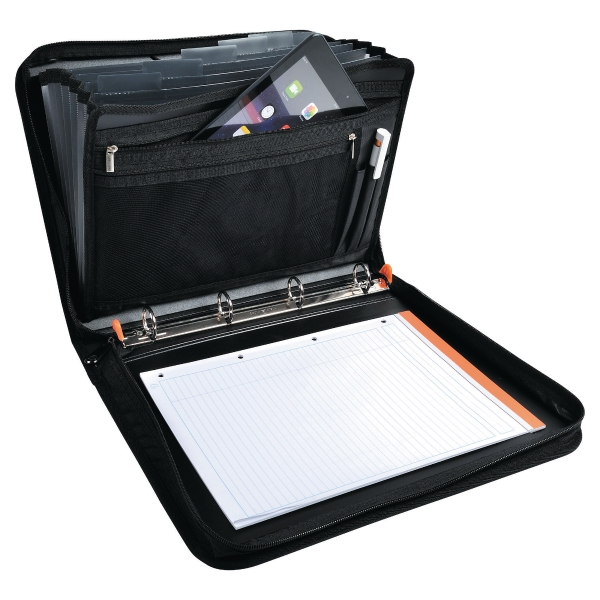 Conferencier valisette avec poignee et fermeture zippee. equipe d’un trieur, de pochettes zippees, d’un compartiment renforce pour tablette et de porte-stylos. ideal pour transporter des documents perfores ou non perfores. livre avec un bloc papier a4 ligne. dimensions : l 27 x 36 cm. polypropylene. pour format a4.