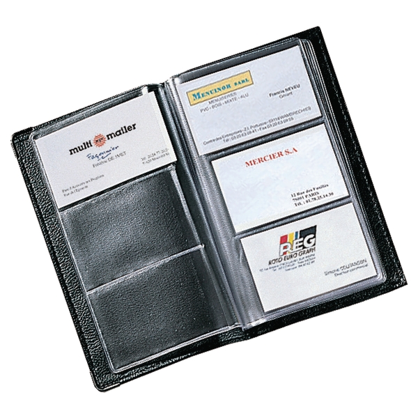 Couverture en vinyle, aspect cuir graine. coins metalliques noirs. porte-cartes pvc souple format de poche et plat permettant de classer jusqu’a 120 cartes de visite (20 faisceaux de 3 cases h 5,6 x l. 9,5 cm). dimensions : h 19,7 x l 11,7 cm.