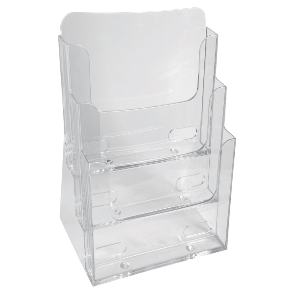Porte-prospectus en polystyrene cristal. 3 poches pour documents au format a5. profondeur utile de 2,8 cm. presentoir monobloc (pret a l’emploi).