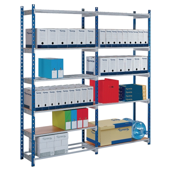 Structure en acier 12.5/10eme finition epoxy bleu. 5 tablettes claires voies en acier 8 et 10/10eme finition epoxy gris. fixation des tablettes par connecteurs 2 griffes. tablettes reglables tous les 5 cm, charge utile : jusqu’a 180 kg par tablette. livre a plat, montage facile par simple emboitement. possibilite d’ajouter un ou plusieurs elements pour constituer des rayonnages illimites. jusqu’a 7 niveaux pour boites d’archives ou stockage. dimensions exterieures : h 200 x l 100 x p 34 cm. produit soumis a eco-contribution. possibilite de prestation de montage.