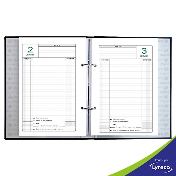 – 12 mois de janvier a decembre. 1 journee par page. – suivi pratique des mouvements de caisse au jour le jour pour transmission periodiques a la comptabilite. – textes en français. – recharges feuillets mobiles 1 jour. – livre sans reliure. – impression