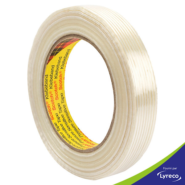 ruban transparent multi-usages pour le cerclage, le bottelage, la fermeture et renforcement de caisses et cartons… a resistance elevee, le ruban est renforce de fils de verre noyes dans la masse. dimensions : 25 mm x 50 m.